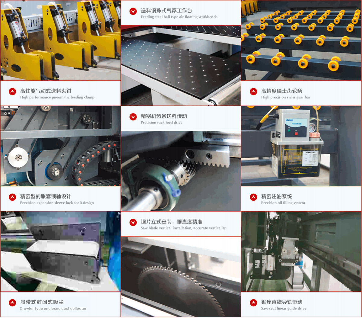 進(jìn)料采用氣動(dòng)浮珠臺(tái)面,厚重板料一樣輕松自如; .